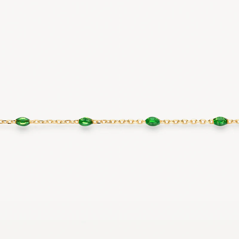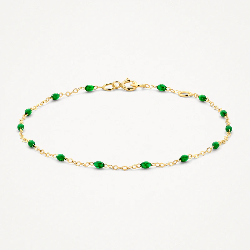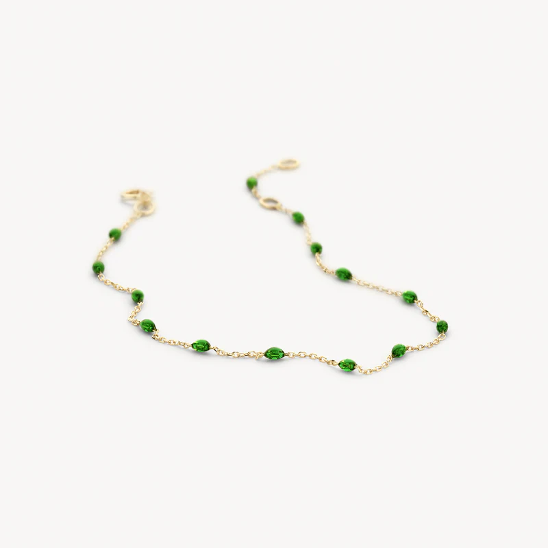 Les pierres en résine d’un vert éclatant de ce bracelet en or jaune 14k attirent tous les regards. Ses maillons ancre (⌀ 0.7 mm) alternent élégamment avec des perles en résine vert vif.