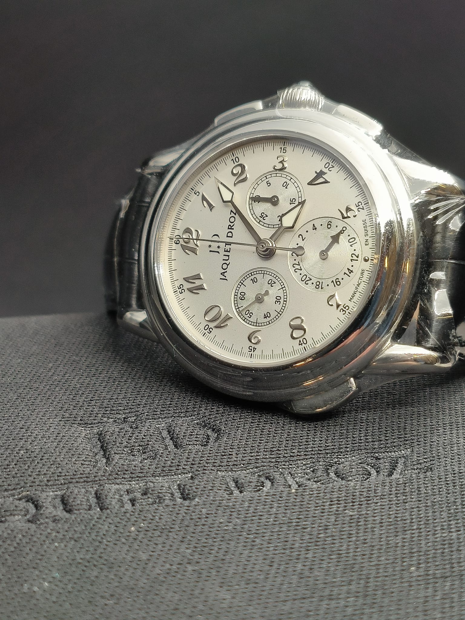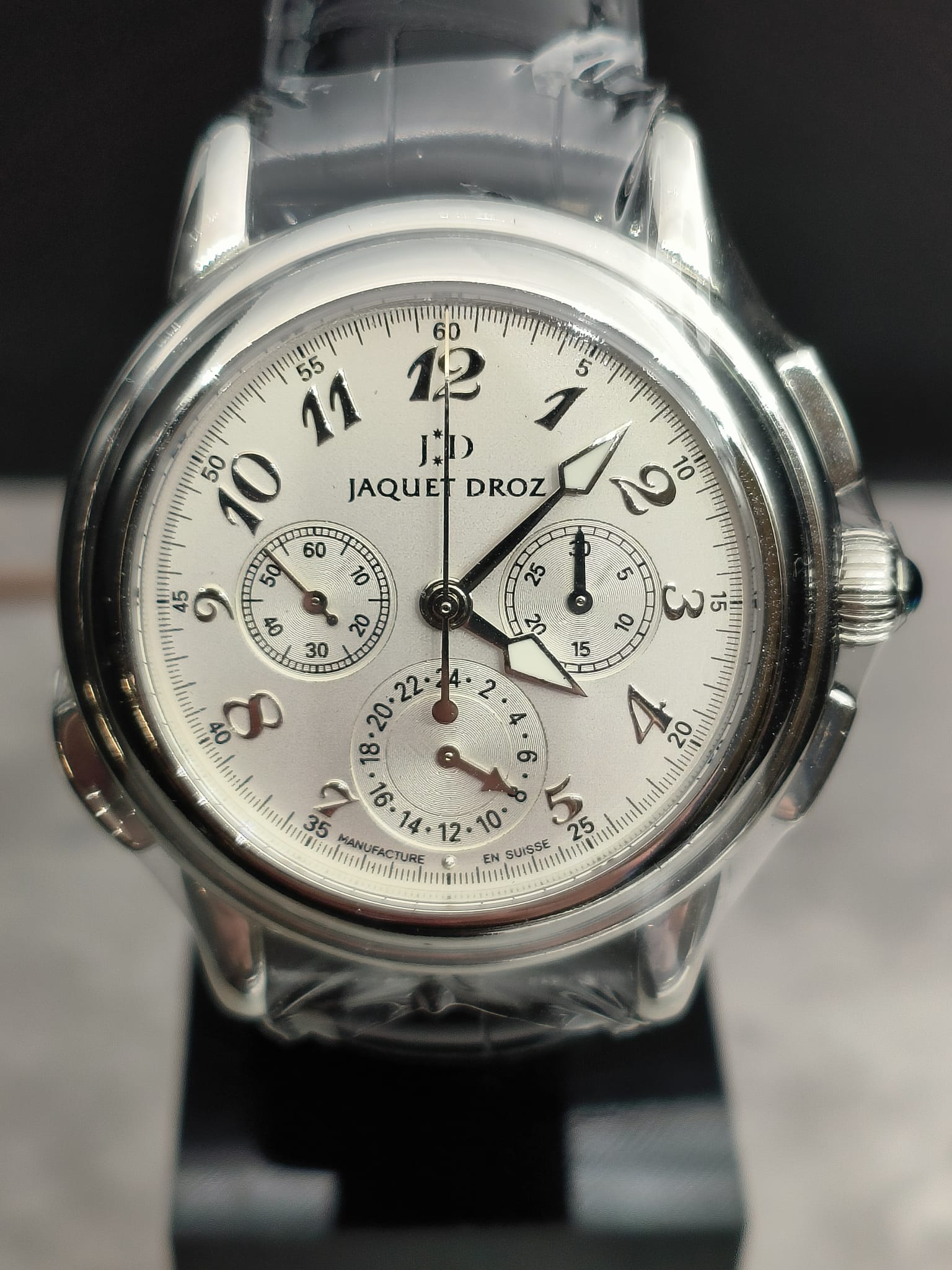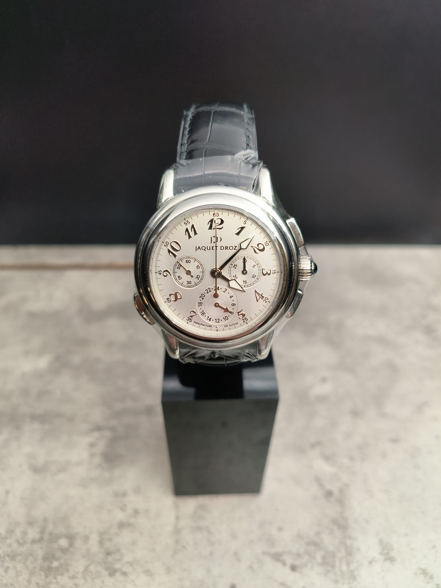 Avec écrin SAV d’origine Jaquet-Droz et sans papier d’origine Jaquet-Droz.