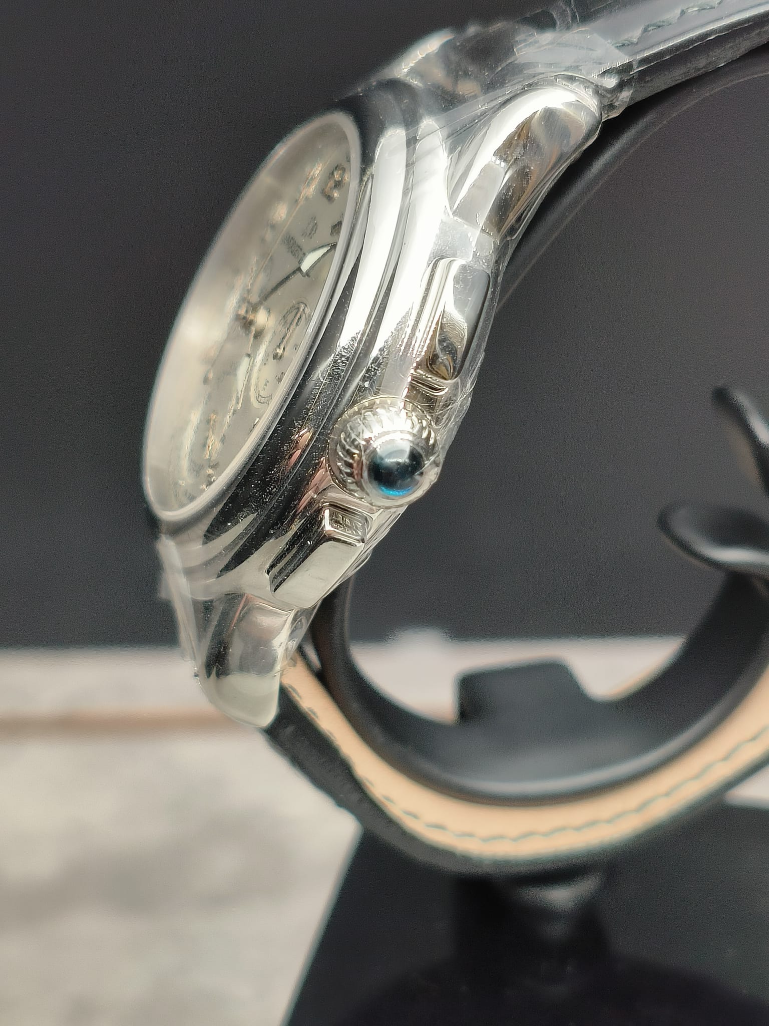Cadran argenté, index chiffres arabes, aiguilles acier.